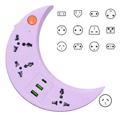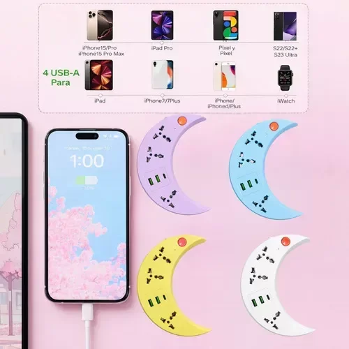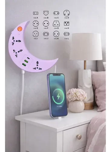 Cargá todo al mismo tiempo: celular, tablet, auriculares, power bank, smartwatch, lámpara, notebook y más. Ideal como zapatilla con USB, alargue con puertos USB, regleta eléctrica moderna, extensión decorativa, zapatilla para escritorio, zapatilla para dormitorio, zapatilla infantil, zapatilla kawaii, zapatilla luna.
