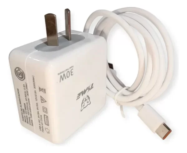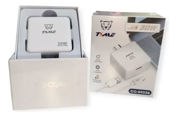 Cargador USB Time 30W con cable USB A a USB-C de carga rápida en 20 minutos QC30 El cargador Time 30W USB-C es la solución ideal para quienes buscan una carga rápida y eficiente para sus dispositivos móviles.