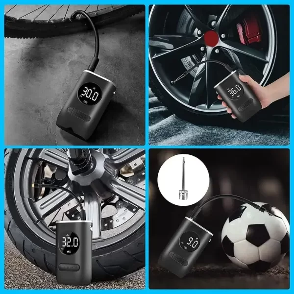 - Bomba de aire multifunción inalámbrica adecuada para inflar neumáticos de coches, motos, bicicletas, balones, flotadores de natación y objetos inflables. Velocidad de movimiento de 21000 rpm para un inflado rápido.