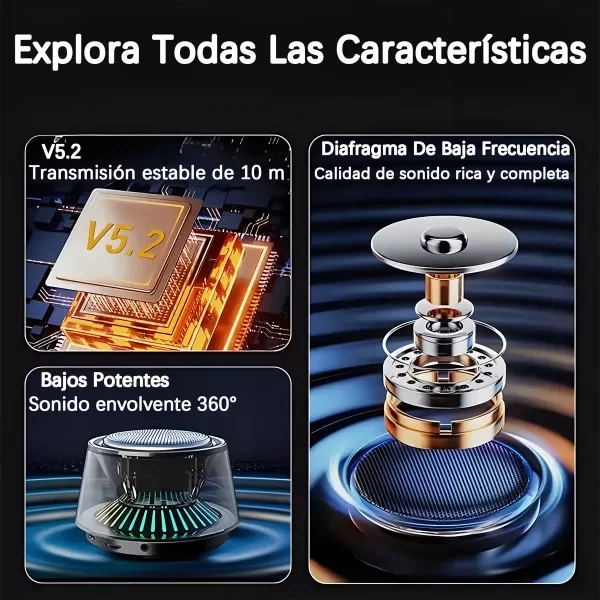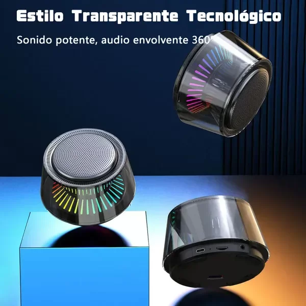 Con nuestro altavoz inalámbrico Bluetooth portátil, experimenta un sonido envolvente 360 incomparable. El audio claro llena todo el espacio, permitiéndote disfrutar de cada detalle de tus canciones favoritas, ya sean melodías suaves o ritmos potentes.