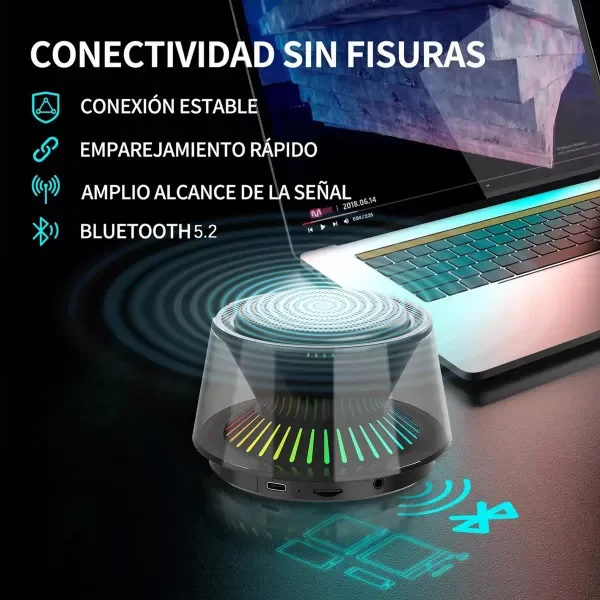 Este altavoz portátil está equipado con la última tecnología Bluetooth 5.2, lo que garantiza una conexión estable y fluida con tus dispositivos. Di adiós a las interrupciones de señal y disfruta de una reproducción de música continua para una experiencia auditiva sin preocupaciones.