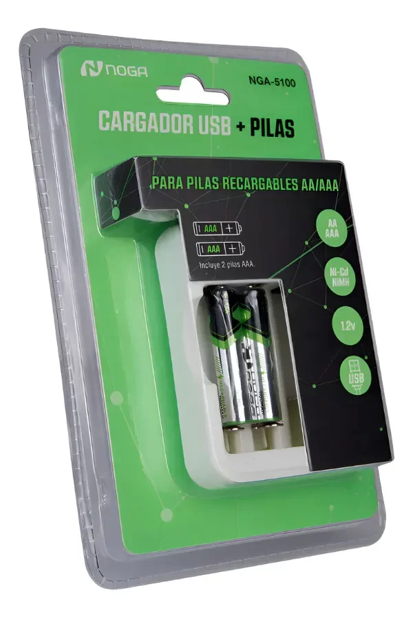 El Noga NGA-5100 es un cargador compacto y práctico, diseñado para cargar pilas recargables AA y AAA directamente a través de un puerto USB. Ideal para mantener siempre tus dispositivos listos sin depender de cargadores voluminosos ni tomas de corriente tradicionales. Características principales - Compatible con pilas AA y AAA recargables. - Alimentación por puerto USB (PC, cargador de pared, power bank). - Indicadores LED individuales de carga. (no indica carga completa, se mantiene siempre en rojo) - Incluye 2 pilas AAA de 1100mAh – 1.2V. - Diseño liviano y portátil, fácil de transportar. Contenido del paquete - 1 Cargador USB Noga NGA-5100. - 2 Pilas AAA recargables de 1100mAh.
