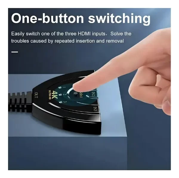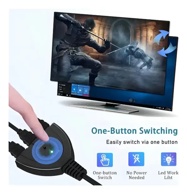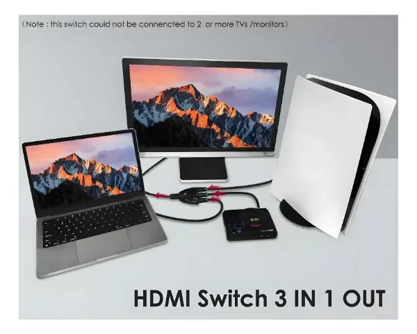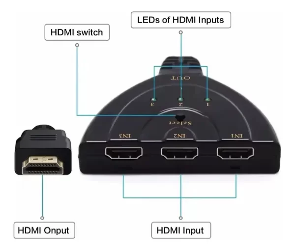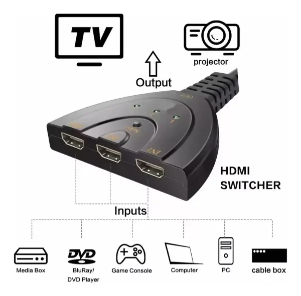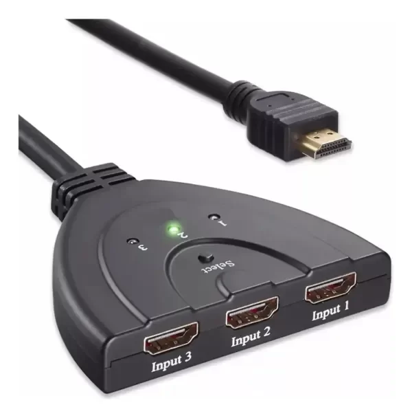 – Conecta 3 Dispositivos a 1 Solo Puerto Dejá de desconectar y reconectar cables cada vez que querés usar otro dispositivo. Con este Switch HDMI 3x1, podés conectar hasta 3 equipos HDMI a un solo puerto de tu TV, monitor o proyector y alternarlos fácilmente con solo presionar el botón Select. Ideal para consolas, TV Box, Blu-ray, PC, notebook o decodificadores. Su sistema de selección manual con indicador LED te muestra cuál entrada está activa, permitiéndote cambiar de fuente en segundos sin complicaciones. Más orden, menos cables. Cambiá entre dispositivos en un solo clic. Imagen nítida y sonido sin pérdida Disfrutá de transmisión 1080p Full HD con audio y video de alta calidad. Sus conectores garantizan una señal estable, reduciendo interferencias, ruido y pérdida de calidad. Perfecto para gaming, películas, streaming o presentaciones. Compatibilidad total Compatible con: Consolas de videojuegos Reproductores Blu-ray / DVD TV Box / Decodificadores Computadoras y notebooks Proyectores y monitores Funciona sin configuraciones complejas. Solo conectar y usar. Diseño compacto y práctico Su diseño elegante en color negro se integra fácilmente a cualquier setup. Incluye cable integrado de 50 cm, brindando flexibilidad para organizar tus dispositivos cómodamente. Compacto, liviano y fácil de transportar. Características técnicas Tipo: Switch HDMI 3 entradas x 1 salida Resolución máxima: 1080p Full HD Selección manual con botón “Select” Indicadores LED de entrada activa Transmisión de audio y video digital Longitud de cable: 50 cm Ancho del dispositivo: 8 cm Compatible con PS, Xbox, TV Box, DVD, PC, Notebook Color: Negro