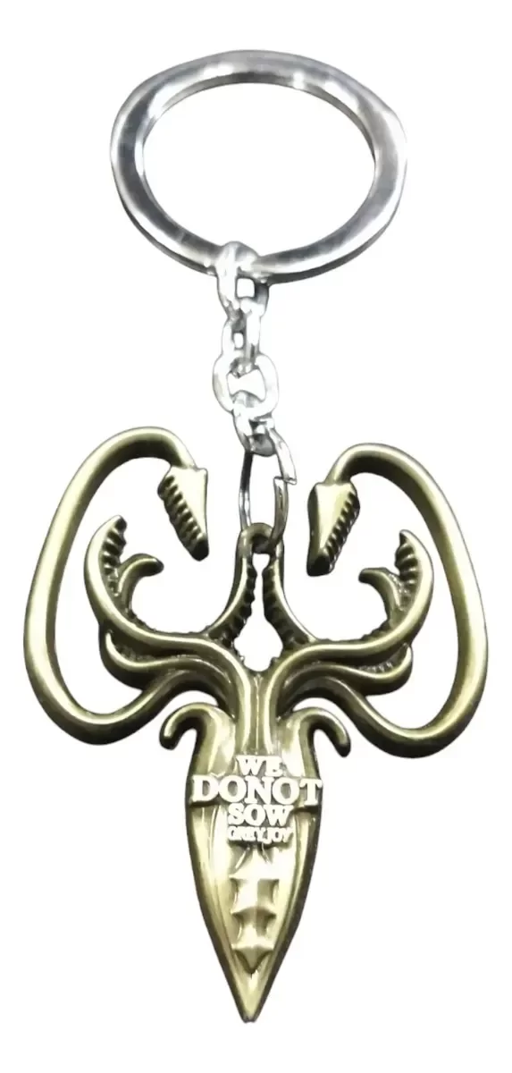 Demuestra tu lealtad a las Islas del Hierro con este impresionante llavero de metal de la Casa Greyjoy, inspirado en el emblema del kraken dorado, símbolo de fuerza, independencia y dominio sobre los mares. Fabricado en metal resistente, ofrece un acabado detallado y de gran durabilidad, ideal para acompañarte en el día a día.