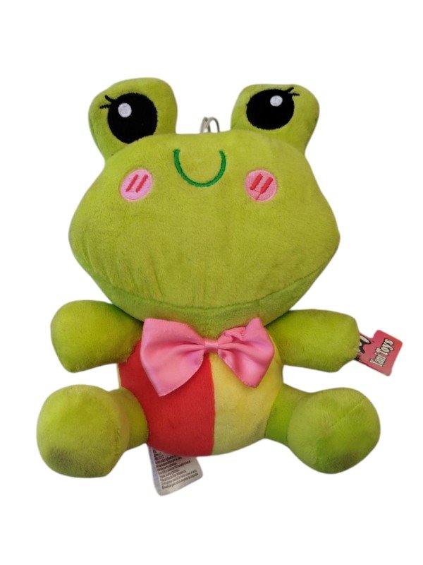 El peluche rana con moño es un muñeco suave y adorable, ideal para abrazar y decorar. Este peluche tiene la forma de una rana, con su característico cuerpo redondo y ojos grandes, bordados o cosidos de manera que le dan un toque tierno y simpático. Su piel está hecha de material suave como felpa, lo que lo hace perfecto para niños de todas las edades.