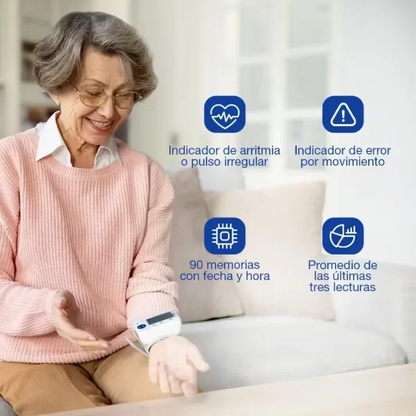 Con este monitor de presión arterial podrás tomar los valores de la presión máxima y mínima en la comodidad de tu hogar. Además, mide la frecuencia cardíaca y advierte la presencia de latidos irregulares potencialmente peligrosos para prevenir posibles arritmias.